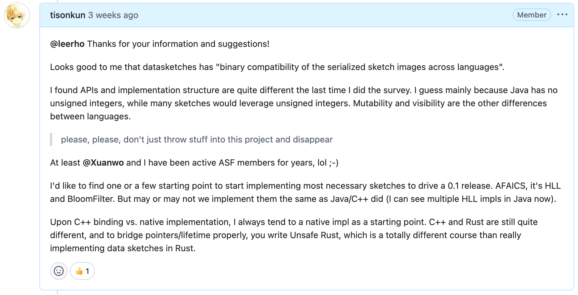 所幸,大约两个月后,Xuanwo 恰好也在开发 iceberg-rust 的过程里产生了对 datasketches-rust 的需求。他在群聊当中提问,而我正好告诉他 DataSketches 的项目现状和人员组成情况。于是我鼓励他直接在 datasketches 项目里提出 Rust 版本的请求,没想到很快就得到了社群的积极反馈。